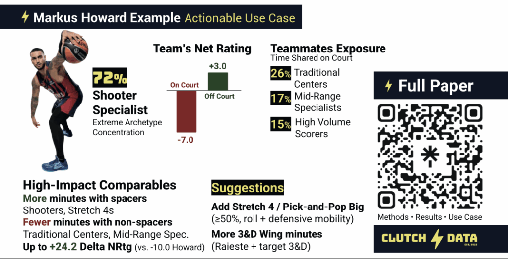 Uno de los ejemplos prácticos incluidos en la investigación se centra en Markus Howard y su papel dentro de Kosner Baskonia. A través del modelo, se analiza cómo su perfil, muy orientado a la generación de tiro y anotación, interactúa con el resto de la plantilla. Este tipo de análisis permite detectar redundancias de roles o identificar qué tipo de compañeros potencian su impacto ofensivo, ofreciendo información valiosa para la construcción del equipo.